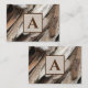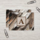 Foto på affärskort och ett monogram för personanpassning. Fotonäring av rustiskt avvanda brunbruna och grått-skorelindrivningsvirke i original. placeras i diagonal vy.