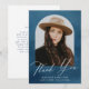 Elegant studenten tackar dig för ett kort med student-foto inuti en båge ram med en marsch blå vattenfärgsbakgrund. "Tack" visas i ett vitt, modernt kalligrafiskript med student namn, skola och grad som visas nedan. Baksidan av fotopapperet med tackkortet studenten ger plats för ditt skrivna eller handskrivna meddelande.