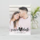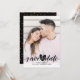 Denna moderna eleganta skriptfoto spara datum-kort har ditt foto och en skriftlig kärlekshjärta spara datum ovanför era namn, datum och lokal. Baksidan har spridda kärlekshjärtan konfetti. Du kan anpassa bakgrunden till din favoritfärg. Designad av Thisisnotme