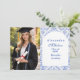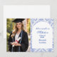 En elegant examensfirande design med en delikat blå toile blommig ram inspirerad av klassiskt europeiskt porslin och vintage botaniska tryck. De invecklade blommorna ramar in en ren välvd mittpanel och skapar en förfinad och tidlös komposition som framhäver examenens namn och evenemangsinformation på ett vackert sätt. Mjuka blå toner mot en skarp elfenbensvit bakgrund ger designen en sofistikerad men firande känsla. Perfekt för en stilfull examensfest med en klassisk, romantisk estetik.