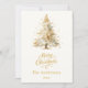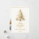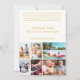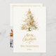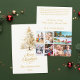 En mjuk beige bakgrund. Dekorerad med ett Julgran täckt i snö. Din text och namn på baksidan. God jul är skrivet med ett elegant handskrivet stil-teckensnitt. Tillbaka: en 7-fotokollage av ditt år under granskning.