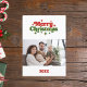 En vit bakgrund, röd text och grönt Text och foto på framsidan. Din text och namn på baksidan. God jul är skrivet med ett retro stil-typsnitt i rött, grönt och faux guld. Tillbaka: En 8-fotorutnätsmall för året som granskas.