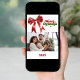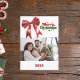 En vit bakgrund, vit text, en röd båge. Text och foto på framsidan. Din text och namn på baksidan. God jul är skrivet med ett retro stil-typsnitt i rött, grönt och faux guld. Tillbaka: En 8-fotorutnätsmall för året som granskas.