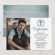 Blåfärgad vattenfärgad löv utandning i blått överst på denna fotodesign med åtföljande blått kor och ord "Bekräftelse" i oredigerbar manustext. Lägg bara till ditt barns foto-, namn- och bekräftelseceremoni och uppgifter om firande. Baksidan har en blå övertoningsbakgrund för vattenfärger. Sammansatt design efter Helgdag Hearts-design (reserverade höger). Bild av platshållarfotoarartighet Unsplash.