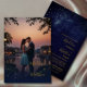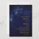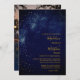 Guld, som ge intryck av stjärnor i himmel, skiner ovanför ord på blå bakgrund. Ett modernt tema för kvällsinbjudan i snyggt personligt bröllp. Ändra enkelt informationen till ditt eget anpassad design. Ändra bilden för ditt eget foto.