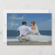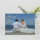 På framsidan finns det ett platshållarfoto av en brud och en groom vid havet. Baksidan är marin blå, med vintage guld blommigt guld gräns lämnat och höger och ett kalligrafiskt skript. Det finns ett guld-hjärta ovanför namn. Texten är gyllene. Tacken ord och meddelandet på baksidan skrivs i ett kalligrafiskt skript för elegant. Dekorationerna i guld kommer från vintage bok från 1912, från det fullständiga politiska arbetet vid Geoffrey Chaucer, som nu är offentligt.