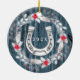 Personlig fotojulprydnad med din hästs foto i det blå virket ram, silver inslag, julkrans och en hästsko från silver på baksidan.
