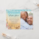 Par-duschinbjudningar till tropisk stranddestination med en gult i rustik ombre till vattenfärgsblå bakgrund, stjärnfisk, seashells, sträng ljus, två hjärtan i sanden med initialer, ett foto av paret och en duschmall i elegant par som är lätt att anpassa.