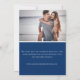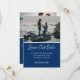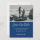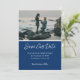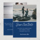 Ett Bröllop spara datum-fotokort med marin blå bakgrund och vit text. Lägg till foton, namn, datum och stad/stat i bröllop och stad/stat. Allt fält kan vara personlig att göra det till ditt eget. Det finns utrymme på framsidan och baksidan för två separata foton. Du kan lägga till mer information på baksidan med webbplatsen bröllop.