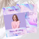 Rosa, lila och blå holografisk bakgrund. Anpassa och lägg till ditt foto och tackkort. Lila text.
