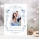 Elegant-helgdag-kort med foto i en båge i ett dammigt blått handritat ram med säsong klockor, bows och poinsettia-blommigtar, "God jul" i ett dammigt blått snyggt-skript och din familj namn och året i klassisk serif-typografi.