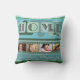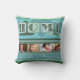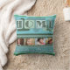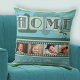 En modern teal grönt-kudde med temat "Hem är ..." med egna foton och egna texter och färska gröntar löv. Vacker för Mors dag eller för att lägga till foton av ditt favoritsällskapsdjur ...