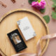 Svart affärskort för fotograf, makeup-artist, hårstilist, mode-designer, sömstress eller mer där du kan visa ditt arbete med ett foto på omslaget inuti ett bågformat ram som är dekorerat med handritade blommor och grön.