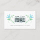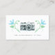 Ett fotografiskt affärskort med en reflexkamera i brännpunkten, omgiven av två delikatmålade blå vattenfärgblommor, skapande ett synligt mästerverk som reflekterar ditt konstnärliga flair.