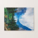 Ett pussel med ett vackert foto av en trevlig och lugn naturscen. Vibrant grönt i fram- och skuggblåa berg i baksidan. Med en grumlig vit himlar. Misty och magisk känsla.