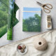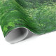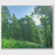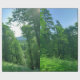 Skogslandfoto. Skogens fredliga grönt i juni med grönt vegetation, grönt träd och morgonsolljus.