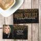En faux glitter i guld över svart anger bakgrunden till affärskortet med mallen namn och rubrik på framsidan. I baksidan finns en samordnad utformning och färg med text fält för företaget namn och detaljer plus ett platshållarfoto. Byt ut platshållarfotot mot ditt. Fyll i fälten eller klicka på anpassa för att välja det teckensnitt som du vill använda stil, storlekt och färg.
