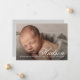 Ett fullt-blekt foto-födelsemeddelande med stort rörligt namn inslag i ett vackert skript med födelseinformation nedan. På baksidan av kortet finns ytterligare två nyfödda foton och föräldrarnas personliga meddelanden eller ytterligare födelseinformation. Hela inslag på det här kortet är anpassade, så det är enkelt att skapa en typ av design genom att byta ut typsnitt och färger på text och färg för att uppfylla dina specifika behov. Kortets baksida är ett idealiskt ställe att även lägga till foton från syskon på det spännande tillkännagivandet från sin nya bror eller syster. Detta skulle också vara ett vackert antagande eller ett vackert tillkännagivande av graviden.