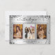 Lägg till 3 av dina födelsedagsfoton, lodrät storlekt, ett datum, namn och tackkortet. En faux silver metallisk tittar bakgrund med svart text och ram, svart faux glitter-gnistor. Texten: Tack på framsidan och ditt namn på baksidan skrivs med ett handskript med snyggt med dekortecken.