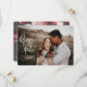 Fotografiskt blomstergeometriskt bröllopsfoto spara datumet. I lila, rosa, bruna och gröna nyanser. Modernt rustikt bröllop med handskriven text.