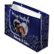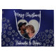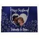 En blå bakgrund. Den blå färg är ojämn. Dekorerad med snöflingor. Anpassa och lägg till ditt/dina namn. Hjärtformade foto ram. Blå text.
