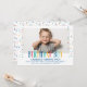 Den här fotoinbjudan innehåller födelsedagspojkens bild, tillsammans med roligt, färglös text och konetti. Den här designen är en perfekt för dina barns födelsedag.