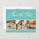 Anpassningsbar vintage stil aqua grönt / blue and white (observera att färg kan ändras i bakgrunden) bröllop spara datum-kort innehåller funktionen "Spara datum" i en handskriven calligraphy-skripttyp för elegant, tre (3) blanksteg för förlovning-foton (tips: skörd till kvadratisk form före uppladdning) och text på baksidan som kan vara personlig med bröllop-information.