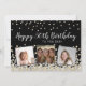 Elegantens anpassningsbar-födelsedagskalender med glatt guld och silver-konfetti över en svart bakgrund, modern skripttypografi med ord "50:e födelsedagen i Lycklig" och tre av dina favoritfoton som är inramade i metallisk silver-folie på kortets framsida tillsammans med ditt meddelande och på baksidan.