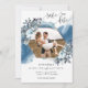 Fantastiskt fyra foto, blå vattenfärg, blå blommigt och Bröllop spara datum-kort för löv. På framsidan får du en attraktiv geometrisk färg som är innesluten av blommor och löv med bilden inuti och en blå vattenfärgsfläck på baksidan. Använda av modern handskriven kalligrafiinformation. På baksidan tre fotokollage med elegant liten ram och initialer går med alla tre fotona tillsammans. En del av vår "Rustic Blue Mountains Collection" med en mängd olika samordningsprodukter tillgängliga.