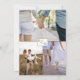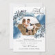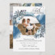 Ett fantastiskt Virtuellt bröllopsinbjudningskort med fyra foto, elegantens blå vattenfärgsfläckar som överlappar bakom det geometriska fotot ram med exquisite blue blommigt och bladdetaljer. Använda av modern handskriven kalligrafiinformation. På baksidan tre fotokollage med elegant liten ram och initialer går med alla tre fotona tillsammans. En del av vår "Rustic Blue Mountains Collection" med en mängd olika samordningsprodukter tillgängliga.