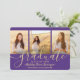 glädjen hos en högskoleexamen eller högskoleexamen och inbjudan familj och vänner att fira med dessa anpassningsbar 4-inbjudningar till lila och guld. Alla bilder och formuleringar är enkla att anpassa. (IMAGE PLACEMENT TIP: Ett enkelt sätt att centrera ett foto exakt som du vill är att flytta det till skörd innan du laddar upp det till Zazzle-webbplatsen.) Den här mallen är formaterad för en studentfest, men kan enkelt anpassas som ett öppet inbjudan eller ett meddelandekort. Ändra helt enkelt texten så att den innehåller valfri information, t.ex. föräldrars namn, speciella arvoden, graderingstitel, favoritcitat, framtida student-planer eller nya adress. Om det finns text som inte är önskad raderar du den. Utformningen har en lila bakgrund, ett faux foil mortar board-lock, handskriven stil-manusgrafi, modern minimalistisk typografi och fyra foton som du själv väljer, t.ex. äldre bilder eller bilder från startceremonin. Observera att guld är tryckt på färg, inte metallfolie. Inbjudningskortet studenten i elegant är ett trendig och en chic för att börja speciella firande. Grattisar till student!