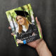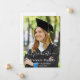 Meddelandekort med handskrivet teckensnitt fullt utfaller porträtt på framsidan med uppgifter om namn och studenten. Baksidan har ett andra foto med ytterligare information. Klicka på knappen Redigera om du vill anpassa designen.