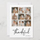 Grattis och familj med det här fotokortet för den här tacksamma familjen Collage med en elegant vit gräns och plats för många-familjens foton. Skriptet med ren design och snyggt "tankfull" gör det till perfekt för Thanksgiving hälsning, helgdag-meddelanden eller att dela speciella ögonblick med nära och kära. Den tidlösa layouten framhäver dina familjefotografier på ett vackert sätt samtidigt som den tillför en varm beröring i säsong. Idealisk för att skicka önskemål på hösten eller skapa ett keepsakkort för julhelgen.