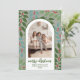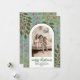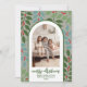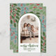 Ett modernt God jul-fotokort i taupe, grönt, rött och vitt. Bilden är en mod med färgad gräns. I den moderna utformningen ingår eukalyptus grenar och bär och sans serif-typ för huvuddelen av texten. Hälsning befinner sig i ett historiskt modernt manus. I baksidan finns en eukalyptus mönster i gröntar och vita.