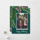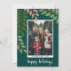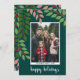 Ett modernt God jul-fotokort i grönt, rött och teal. Den moderna, abstrakta utformningen omfattar löv och grenar samt bär och sans serif-typ för huvuddelen av texten. Hälsning befinner sig i ett historiskt modernt manus. I baksidan finns en eukalyptus mönster i gröntar och korall.