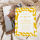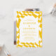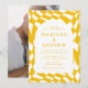 Inbjudan gäster firar din speciella dag med snyggt Retro Gult Checkerboard-fotobröllopsinbjudningar! Visningarna i inbjudningarna namn och bröllop i gult med ett brev omgivet av en vit båge ram. Bakgrunden är en schackbräda för abstrakt mönster med gult och vit färg. Inbjudan återgår till visningen av förlovningen för fullt-utfall i lodrät.