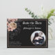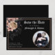 Vackert, spara datumkortet med guld-blommigt och beige och rosa med ängar, kvistar, korvfjädrar och bär på svart bakgrund. Typografi av Götetiska blackletter läggs till i designen. Anpassa med ditt eget foto och bröllop-datum och ställe. Se samordna artiklar i vår butik Enchanted Finch eller kontakta oss om du vill ha fler artiklar.