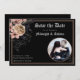 Vackert, spara datumkortet med guld-blommigt och beige och rosa med ängar, kvistar, korvfjädrar och bär på svart bakgrund. Typografi av Götetiska blackletter läggs till i designen. Anpassa med ditt eget foto och bröllop-datum och ställe. Se samordna artiklar i vår butik Enchanted Finch eller kontakta oss om du vill ha fler artiklar.