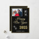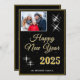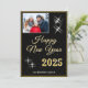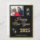 Modern och elegant Guld Black Gott nytt år 2025 Elegant Sparkles Photo Helgdag Card. Vita gnistor på en svart bakgrund och i ett trendig-skript. Lägg till ditt foto på framsidan och din önskan på baksidan.