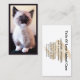 Affärskortet på framsidan har mitt platshållarfotografi av lodrät på nära håll av den här berömvärda siamesiska kattungen. All affärsinformation finns på baksidan av kortet i ett vågrät format. Fyll i fält med information om mallen, ta bort all text och/eller använda som redigeringsdesignen verktyg om du vill markera det teckensnitt som du vill använda stil, storlek och färg. Behålla eller ersätt platshållarfotot med lodräts format fotografi/bild/logotyp eller lämna det som det är. Med ett djurrelaterat foto fungerar denna design för djurrelaterade jobb och särskilt hundvalkare, sällskapsdjur sitta, djurvård eller fosterföräldrar. Ändra fotot för ett annat företag.