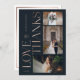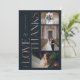 Tack för ditt kort, fetma, elegant och romantiska foton från bröllop. Med tre foton för visning av dina vackra bröllop-foton. "Kärlek och tack" visas i en elegant faux guld typografi med ro med namn och datum med vackert ordnade arrangemang. Den omvända sidan har eleganten faux ro guld ram med utrymme att ge skriva ditt eget personlig-meddelande.