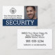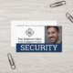 Det här affärskortet har en professionell med en "SECURITY"-rubrik över grund-delen över en blå banderoll. Ett exempelskyddsfoto placeras på högerna som du kan anpassa för att inkludera ditt eget foto-ID. Ett företag eller en logotyp som ingår i urvalet placeras på den lämnat, följt av en anställd och ett företag namn. Säkerhetsföretaget eller den fasta informationen och kontaktinformationen placeras på baksidan.