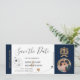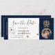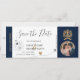 Boardingkortet Biljett Guld Flygplan vid destinationsbäckenet Spara datumet med hjärta och flygplan med faux guld vapensköld. Lägg till ditt foto