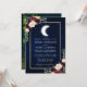Kallelse till festbröllop. Vattentärsblå natten himlar med stjärnor och måne. Burgundy Blue Rosa Blommigt. Greenery Eucalyptus Löv. Guld Ram. Foto bakåt.