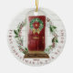 Perfekten är en ornament grundsten för nytt par, nya lyweder och familjer som firar sin första jul i sitt nya hem. Vår design har en egen handmålad, vattenfärgad, röd ytterdörr med en fin julkrans helgdag. Whitewood skiftar bakgrunden med festive holly greenery wand ram. Anpassa med din familj namn på ytterdörrmattan och året. Den omvända sidan har en festlig, grå andedräkt, adress och familjefoto. Alla illustrationer är handmålade originalteckningar enligt Moodthology.