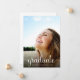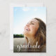 Ett modernt studenten-meddelande med gradens foto överlagrad med "student" i ett vitt skript med dekorationer och deras namn och klassår i enkel vit typografi.