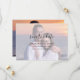 Det här söt skriptet med fotoövertäckning av bröllop spara datum är både modernt och snyggt. Vit övertäckning på fotot med dina detaljer på framsidan och färg på baksidan.