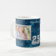 Ett silver ram på vardera sidan visar två av dina favoritfotografier på eleganten Silver Bröllop-årsdagen för keepsaké mugg. Det är lätt att ladda upp dina egna foton! Mellan de två fotografierna finns den stiliserade silver-texten som säger "25 Silver", och anpassningsbarna för det högtidliga parets första namn. Allt placeras på en glatt nattlig bakgrund av himlar blå och silver. En fin keepsakigåva!
