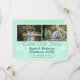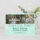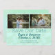 Grönt av persikoglas och spara-till-datum-kort med blå foto. För paret som planerar ett strandmål, eller en tropisk plats, händelsen bröllop, innehåller det här kortet två fotomallar överst. Modern typsnitt med "spara till datum" eller "spara datum", namn, datum för bröllop, plats och webbplatsmallar som tillval. Söt tropiska färg av akvamarin, grönt av havsskum och turkos.