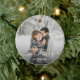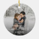 Minneshögtidlighålla den första julen i giftermål med denna vackra moderna keepsaksprydnad. Den vita texten lyder "Vår första jul som Mr & Mrs", med ord "Mr & Mrs" i handskriftsskript i elegant med blommor före och efter. Ersätt exempelbilden med ditt favoritfoto och lägg till efternamnet och året. Ett övertoningsfilter för mörk hjälper till att göra textpopup.